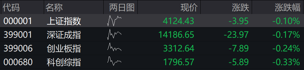 沪指低开0.1% ,深证成指低开0.17%,创业板指低开0.24%,科创综指低开0.33%。